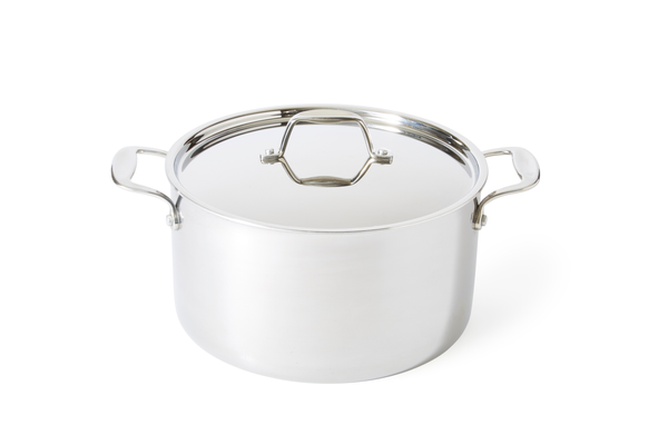 Fully clad tri-ply construction means each pan is formed from a sandwich of two layers of stainless steel and an aluminum core. This gives our pans the even and quickly-heating properties of aluminum and the heat retention and durability of stainless steel.