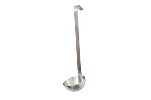 Stainless steel. 5-ounce capacity. Handle hook so it doesn't fall into your soup.
