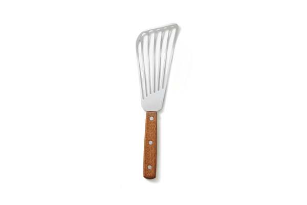 Flexible steel blade for getting under delicate foods. Riveted wooden handle.